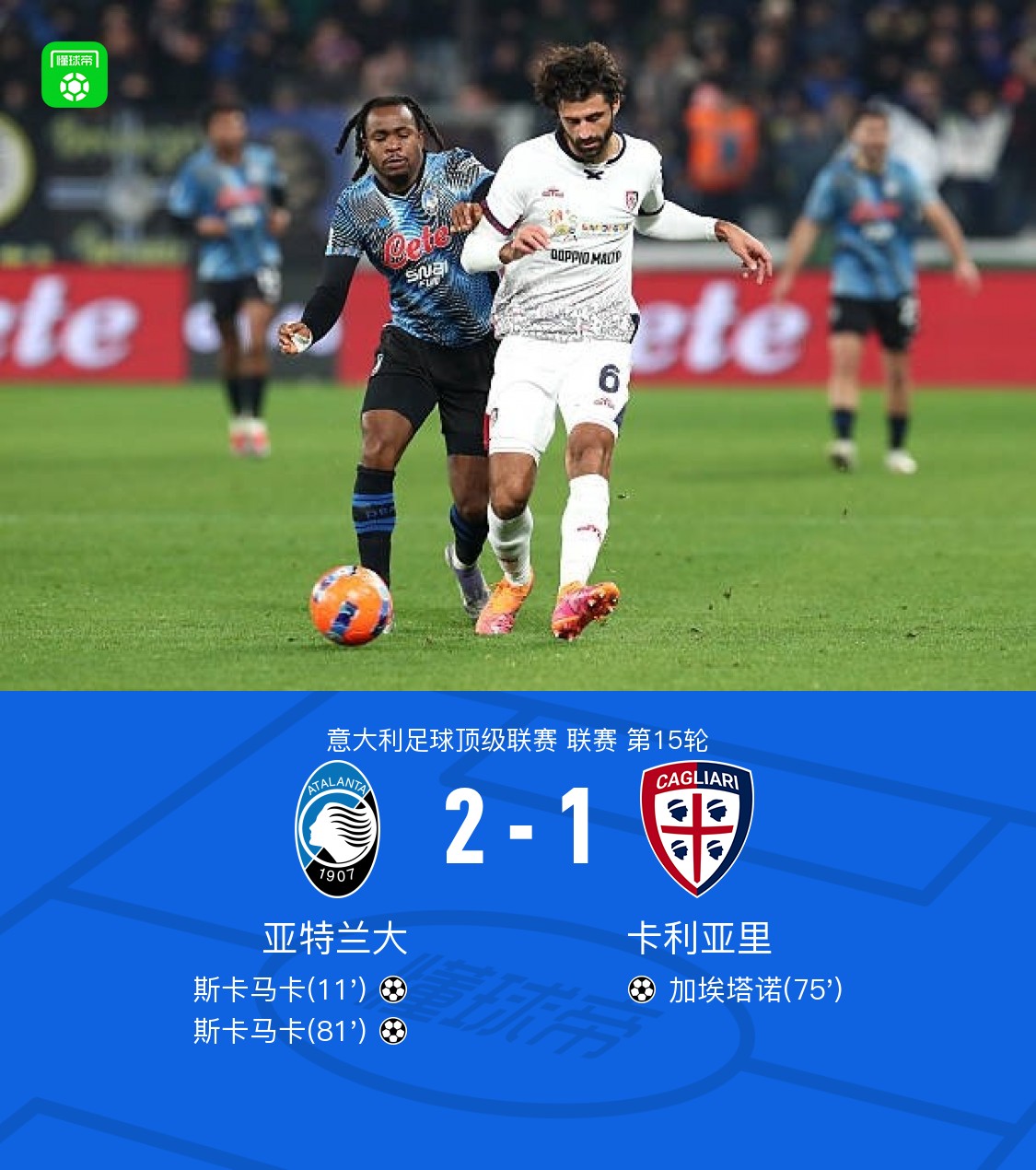 半场战报:亚特兰大1-0卡利亚里,斯卡马卡破门