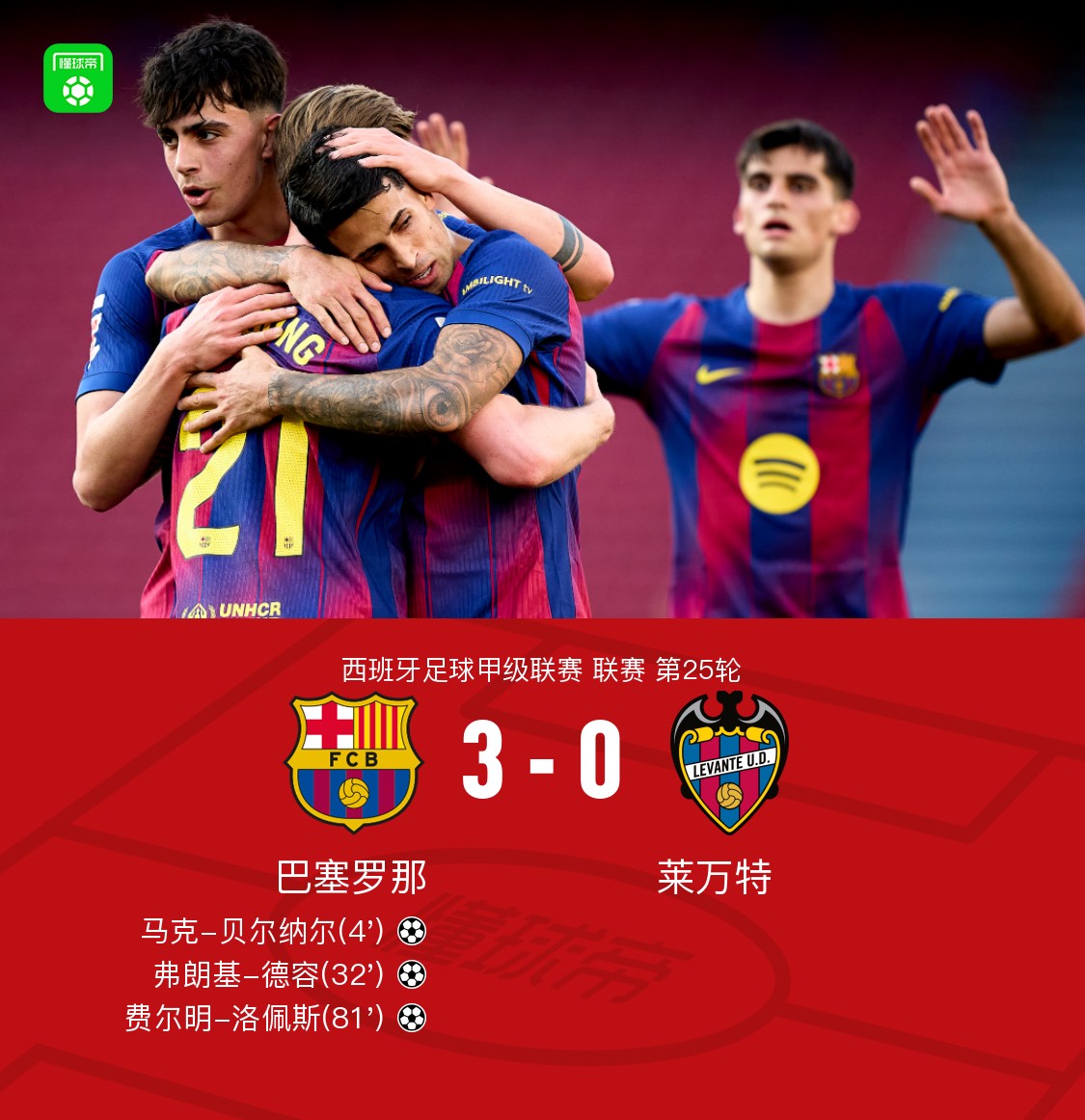 北京时间2月22日西甲联赛第25轮,巴塞罗那主场对阵莱万特。马克-贝尔纳尔开场闪击,弗朗基-德容插上破门扩大领先,费尔明-洛佩斯世界波锁定胜局,马修-瑞安神扑难救主。最终,巴萨主场3-0轻取莱万特,重登西甲榜首。点击查看本场比赛详细数据>>点击查看西甲完整积分榜>>关键事件第4分钟,埃里克-加西亚横传,贝尔纳尔铲射破门,巴萨1-0莱万特!第32分钟,坎塞洛传中,德容后插上垫2026-02-23 01:14:54